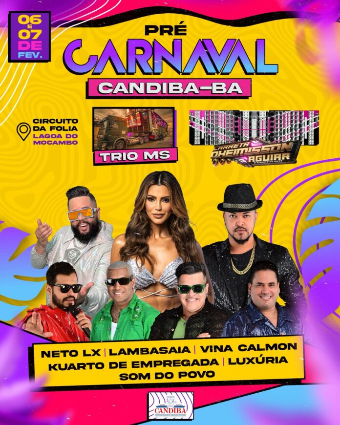 No CIRCUITO LAGOA DO MOCAMBO, cartão postal da cidade de CANDIBA, nos dias 06 e 07 DE FEVEREIRO, o Pré Carnaval contará com a Carreta DHEIMISSON AGUIAR (A GIGANTE DE IRECÊ) e TRIO MS.