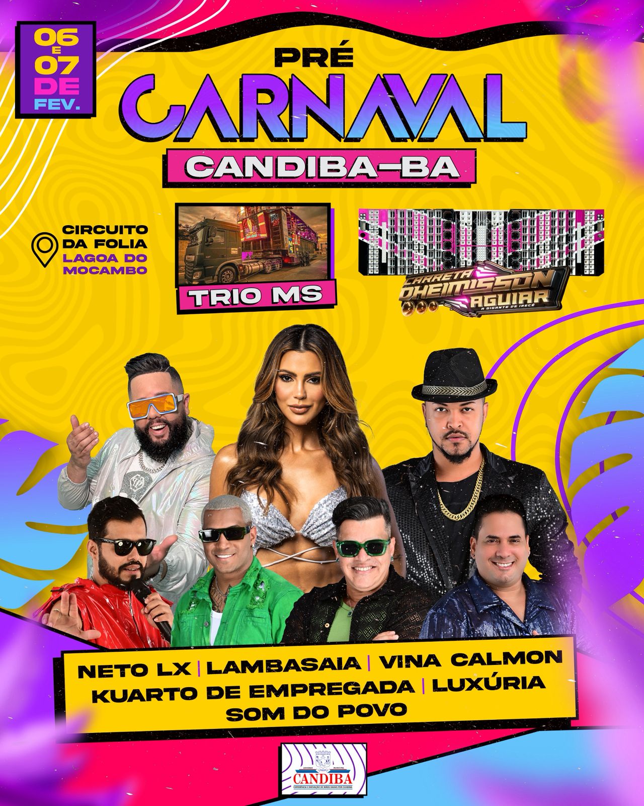 PRÉ CARNAVAL DE CANDIBA, 06 e 07 de Fevereiro, NETO LX, LAMBASAIA, VINA CALMON, KUARTO DE EMPREGADA, LUXÚRIA, SOM DO POVO, Carreta DHEIMISSON AGUIAR (A GIGANTE DE IRECÊ), TRIO MS, no Circuito LAGOA DO MOCAMBO; Realização: Prefeitura de CANDIBA